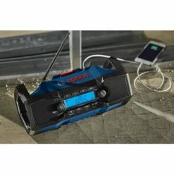 The Bosch GPB18V-2C is a portable and flexible cordless jobsite radio featuring Bluetooth® 5.0 technology. High-performance speakers featuring enhanced bass response delivers outstanding sound clarity and quality. Bluetooth® connectivity enables users to listen to their favorite music streaming service including Pandora®, Spotify® and Apple Music®, or stored songs via their mobile device (from up to 100 Ft. away). An AUX IN connection is included for MP3 players or portable satellite receivers. Additionally, the unit includes digital radio tuning with eight FM presets and four AM presets. Keeping mobile devices charged and ready is made easy with the onboard USB port. Convenient handles and hanging hook make this radio easy to carry and place on the jobsite, in a workshop, or anywhere you play. Power is provided by Bosch’s 18V Lithium-ion batteries (sold separately) or the included AC/DC power adapter. It features jobsite-tough construction, and it is IP54 rated.